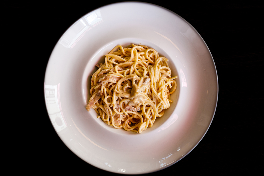 Ingrediente: paste, bacon, ou, smântână, oregano, ulei măsline, usturoi